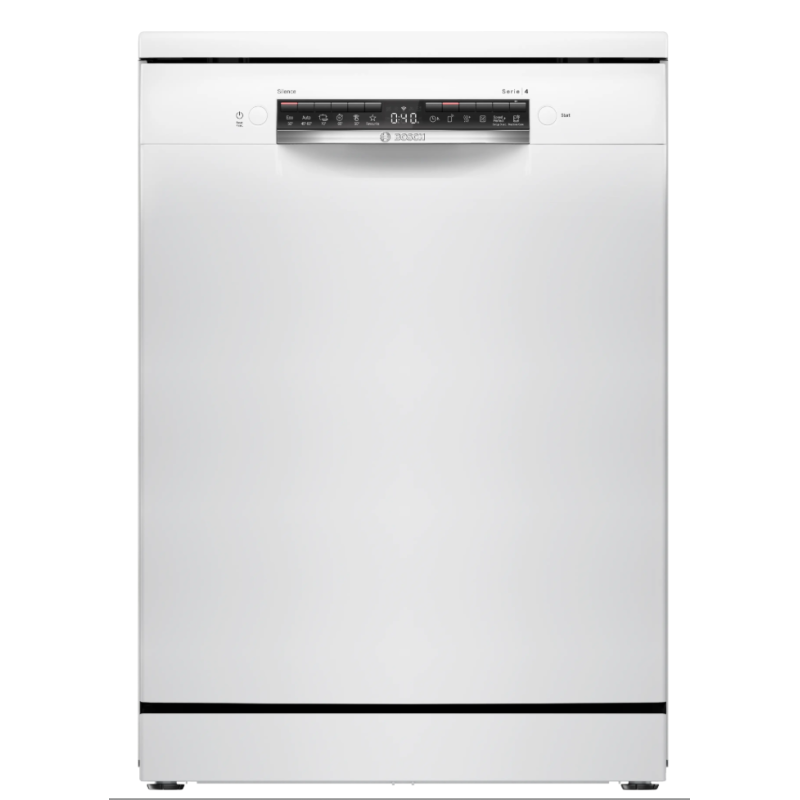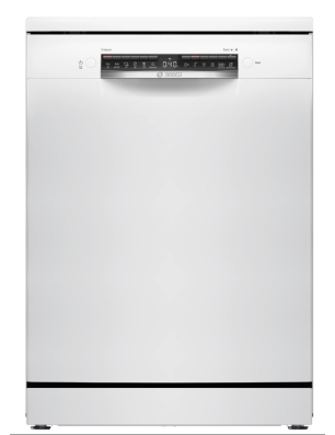 Lave-vaisselle Serie 4 Pose-libre Classe D, Home Connect, 6 progr, 5 options, blanc, échangeur thermique, cuve Polinox, 9,0 l, 46 dB, panier Vario Flex, Rackmatic 3, 7 segments display direct select Blanc D