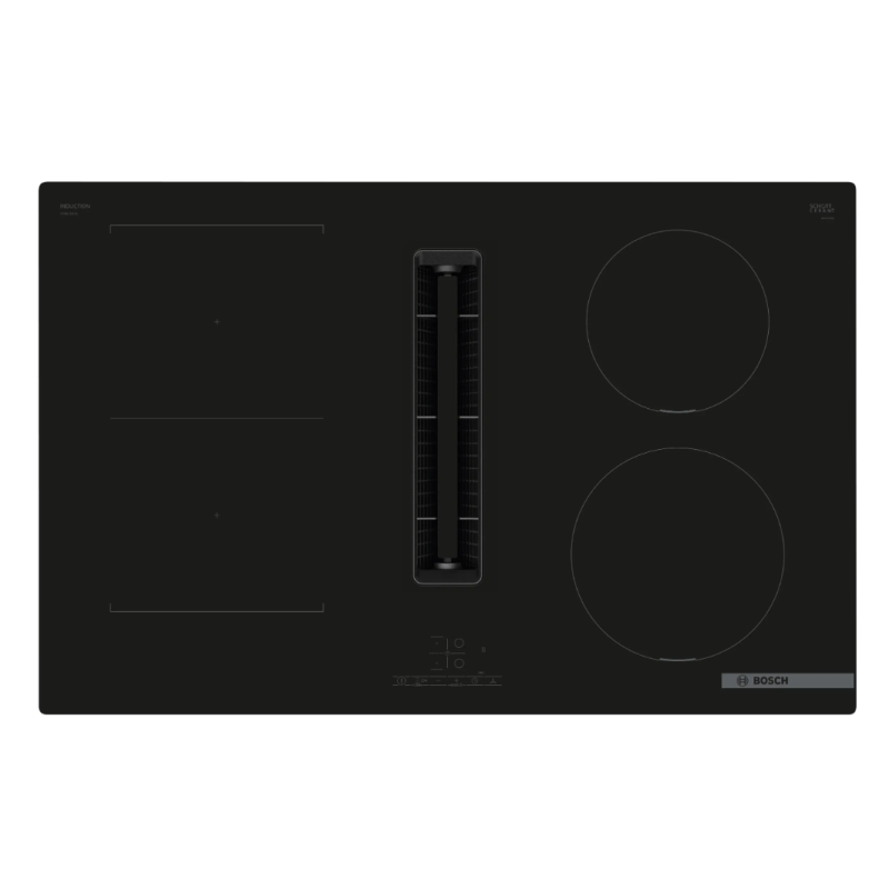 Table de cuisson Serie 4 Induction-ventilation intégrée 80 cm, CombiInduction, 4 zones, 1 CombiZone, Touch Select avec 17 positions de réglage, Power Boost toutes zones, 2 timers, EcoSilence drive, 3 niveaux + 1 intensif, 500 / 622 m3/h, 69 dB, sans cadre, 7.400 W, classe B Sans cadre B