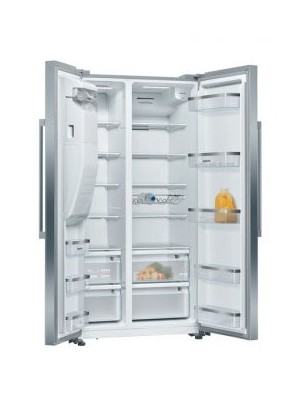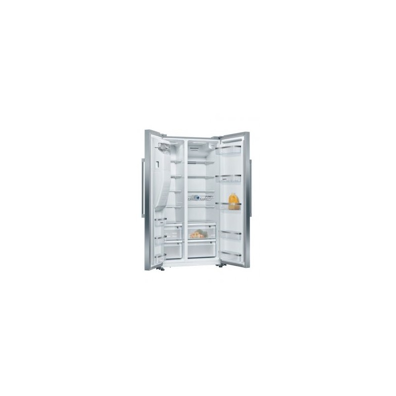 Réfrigérateur - pose-libre IQ500 Side-by-side NoFrost Total noFrost, Classe E, 42 dB, éclairage LED, support bouteilles chromé, 371 l, 191 l, portes acier brossé AntiFingerprint, poignée extérieure, Automatic ice cube maker, hauteur 178,70 cm Portes acier brossé AntiFingerprint E