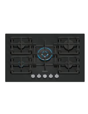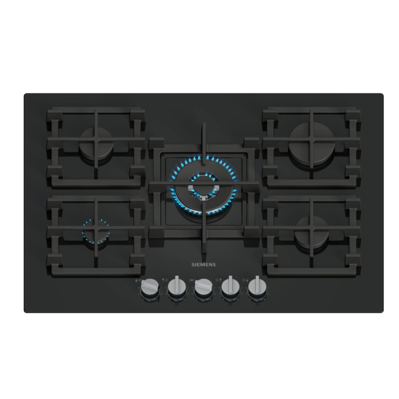 Table de cuisson IQ500 Gaz 75 cm, verre trempé, 5 brûleurs, wok central 4,0 kW, boutons rotatifs détachable, stepFlame® Technology, fonte (individuel) avec pieds en caoutchouc, lavable au lave-vaisselle, noir, à semi-fleur de plan Noir