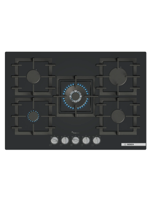 Table de cuisson Serie 6 Gaz 75 cm, verre trempé, 5 brûleurs, wok central 4,0 kW, boutons rotatifs détachable, FlameSelect, fonte (individuel)