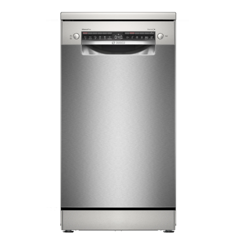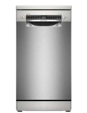 Lave-vaisselle Serie 4 Pose-libre 45 cm Classe B, Home Connect, 6 progr, 5 options, InoxLook, échangeur thermique / drying assist, cuve inox, 8,7 l, 44 dB, tiroir à couverts, panier Max Flex, Rackmatic 3, 7 segments display direct select Acier brossé AntiFingerprint B