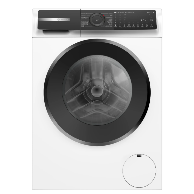 Lave-linge Serie 6 Pose-libre Classe A, -20%, 9,0 kg, 1.400 tr/min, Iron Assist, Home connect, 4D Wash, grand display LED avec touches tactiles, éclairage tambour, waveDrum, Aqua Protection Plus, 72 dB, moteur BLDC avec 10 ans de garantie moteur, Semi 2, black-chrome, black grey Blanc A-20%