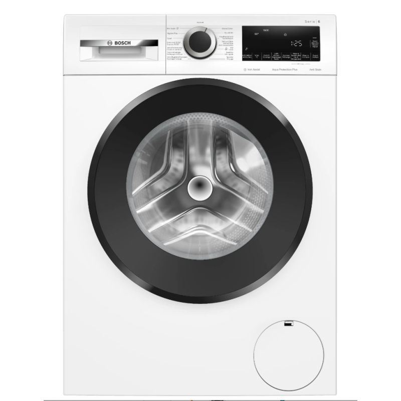 Lave-linge Serie 6 Pose-libre Classe A, 9,0 kg, 1.600 tr/min, Antitaches, Iron Assist, grand display LED avec touches tactiles, waveDrum, Aqua Protection Plus, 74 dB, moteur BLDC avec 10 ans de garantie moteur, Semi 2, black-blackgrey Blanc A