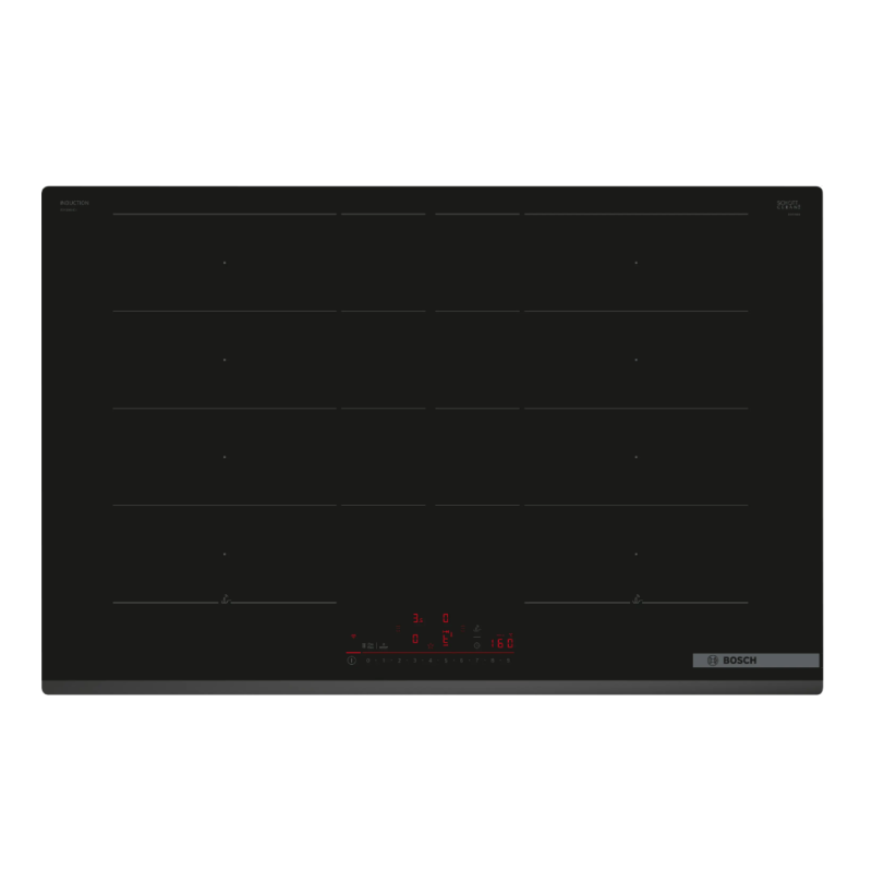 Table de cuisson Serie 6 Induction 80 cm, FlexInduction Plus, 2 zones flexibles étendues, DirectSelect avec 17 positions de réglage, Easy FlexZones, PerfectFry Plus, Power Boost toutes zones, 2 timers (alternative), Home Connect - Hood Control, Smart Hood Automatic, biseau avant, 7.400 W Sans cadre, devant biseauté