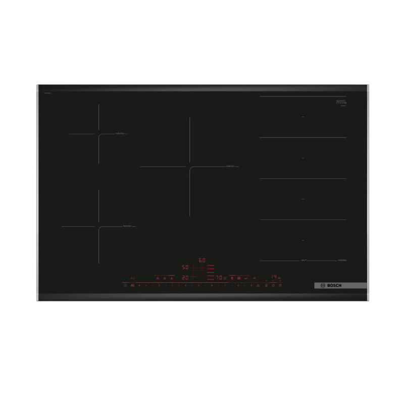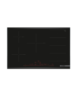 Table de cuisson Serie 8 Induction 80 cm, FlexInduction, 5 zones, 1 FlexZone, DirectSelect Premium avec 17 positions de réglage, Easy FlexZones, Move Mode (3 niveaux), PerfectFry, Power Boost toutes zones, 3 timers, Home Connect - Hood Control, Comfort Profile, 7.400 W Facette inox