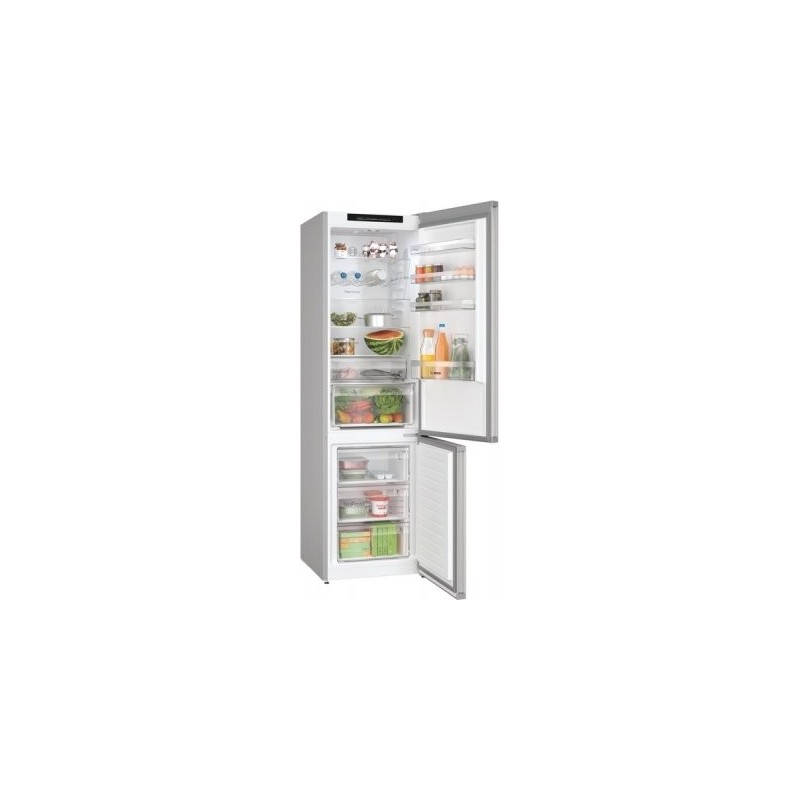 Réfrigérateur - pose-libre Serie 4 Bottom-Freezer NoFrost NoFrost, Classe B, 33 dB, LED à allumage progressif (SoftStart), support bouteilles chromé, 260 l, 103 l, portes metal look, poignée intégrée, 1 ice cube tray, hauteur 203,00 cm Portes finition métallisée B