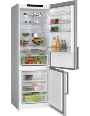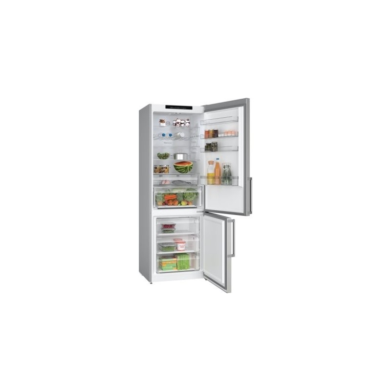 Réfrigérateur - pose-libre Serie 4 Bottom-Freezer NoFrost NoFrost, Classe C, 35 dB, LED à allumage progressif (SoftStart), support bouteilles chromé, 311 l, 129 l, portes acier brossé AntiFingerprint, poignée extérieure, 1 ice cube tray, hauteur 203,00 cm Portes acier brossé AntiFingerprint C