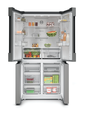 Réfrigérateur - pose-libre Serie 4 French Door noFrost NoFrost, Classe E, 38 dB, display LED, in door, éclairage LED, 405 l, 200 l, portes acier brossé AntiFingerprint, poignée intégrée, 1 ice cube tray, hauteur 183,00 cm Portes acier brossé AntiFingerprint E